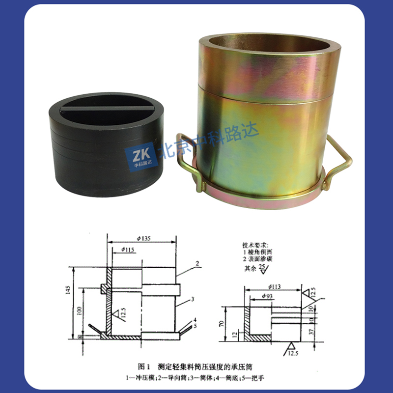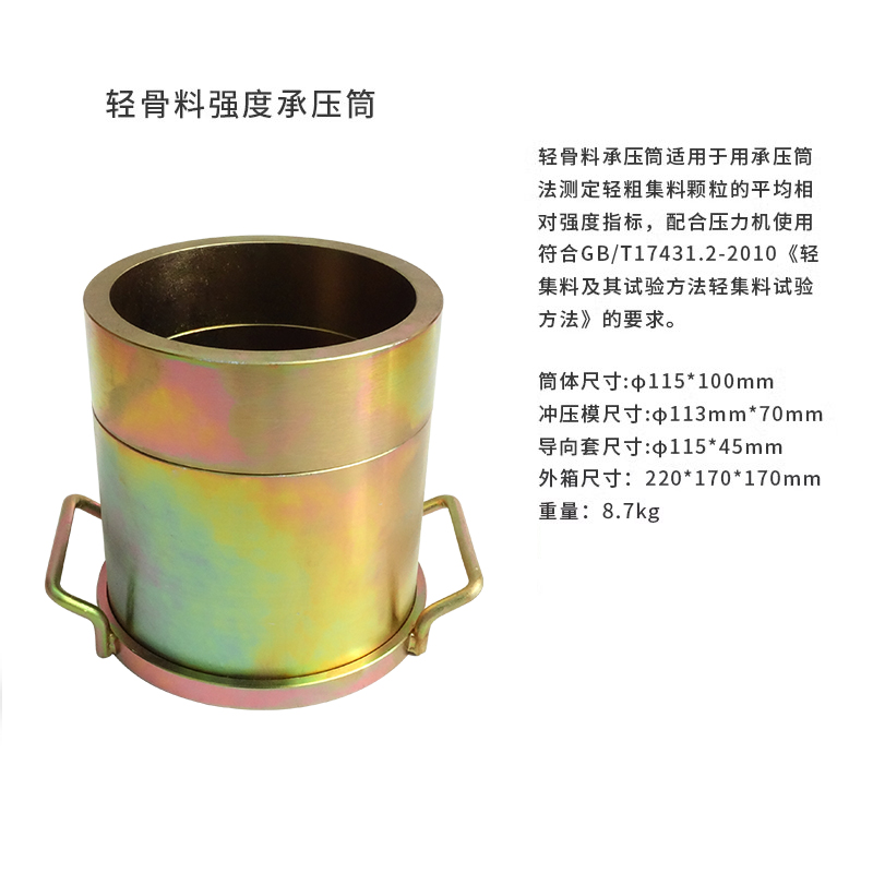 輕骨料承壓筒適用于用承壓筒法測定輕粗集料顆粒的平均相對強度指標,配合壓力機使用。符合GB/T17431.2-2010《輕集料及其試驗方法輕集料試驗方法》的要求。