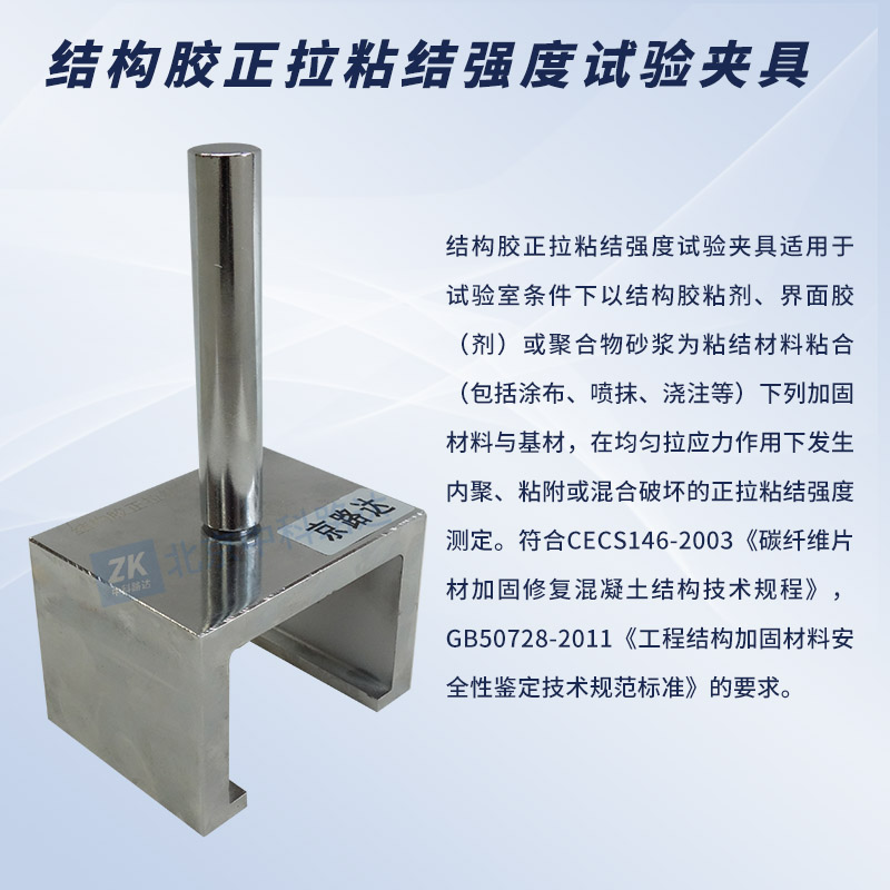 結(jié)構(gòu)膠正拉粘結(jié)強度試驗夾具適用于試驗室條件下以結(jié)構(gòu)膠粘劑、界面膠(劑)或聚合物砂漿為粘結(jié)材料粘合(包括涂布、噴抹、澆注等)下列加固材料與基材,在均勻拉應(yīng)力作用下發(fā)生內(nèi)聚、粘附或混合破壞的正拉粘結(jié)強度測定。符合CECS146-2003《碳纖維片材加固修復(fù)混凝土結(jié)構(gòu)技術(shù)規(guī)程》,GB50728-2011《工程結(jié)構(gòu)加固材料安全性鑒定技術(shù)規(guī)范標(biāo)準(zhǔn)》的要求。