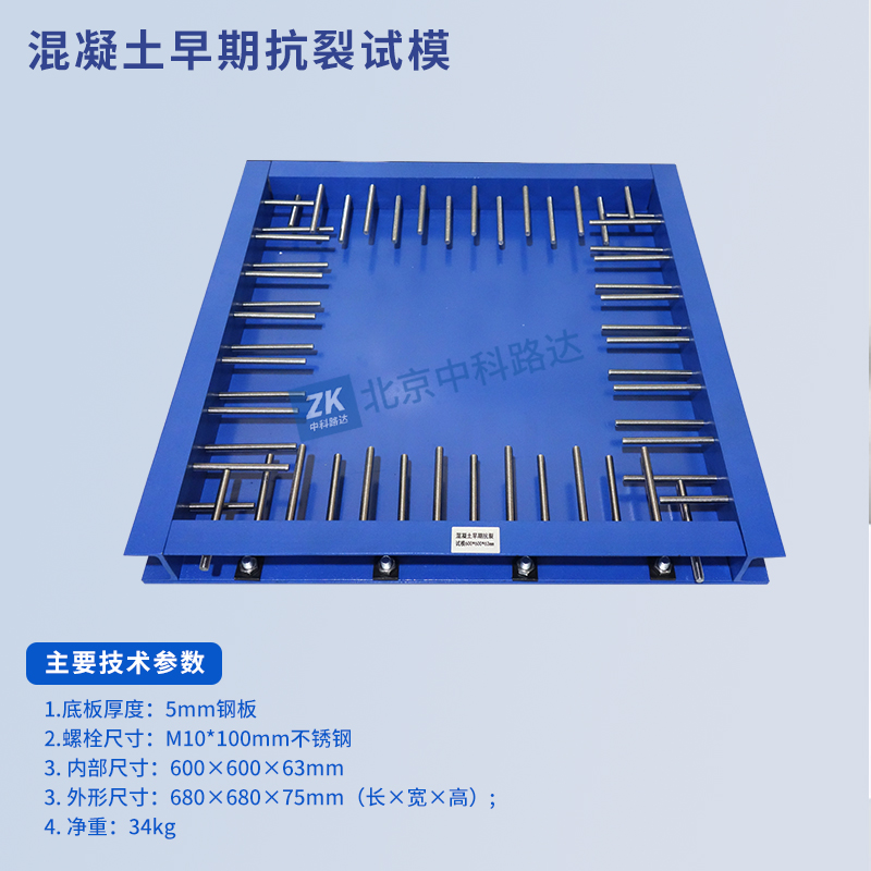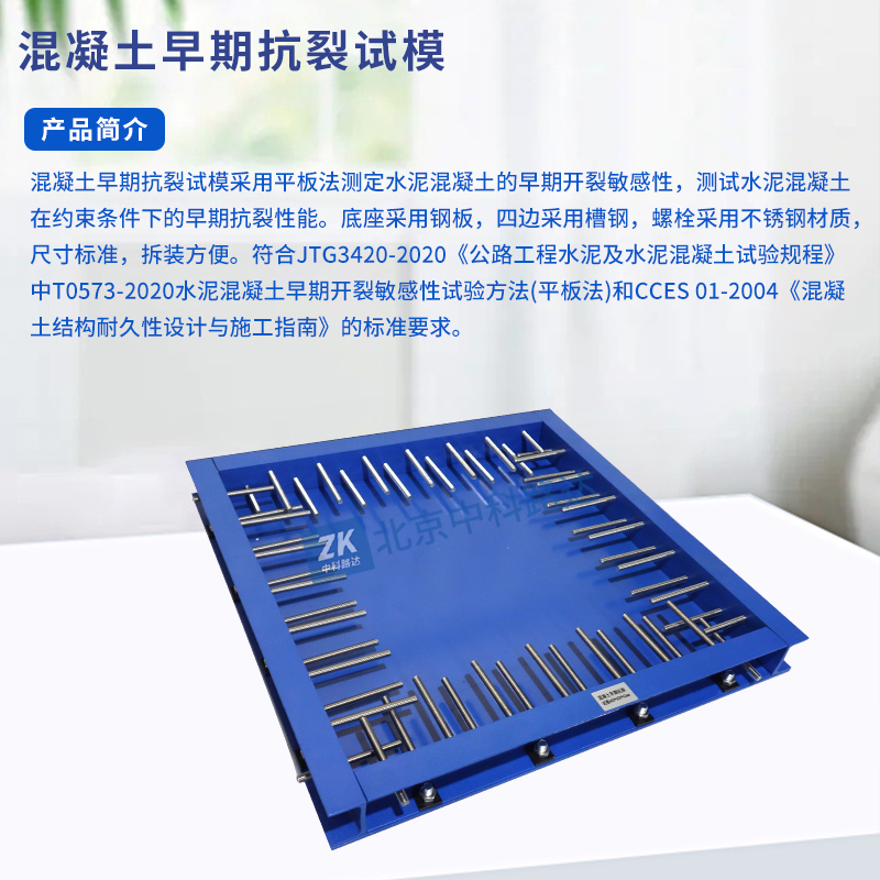 混凝土早期抗裂試模采用平板法測定水泥混凝土的早期開裂敏感性,測試水泥混凝土在約束條件下的早期抗裂性能。底座采用鋼板,四邊采用槽鋼,螺栓采用不銹鋼材質(zhì),尺寸標準,拆裝方便。符合JTG3420-2020《公路工程水泥及水泥混凝土試驗規(guī)程》中T0573-2020水泥混凝土早期開裂敏感性試驗方法(平板法)和CCES 01-2004《混凝土結構耐久性設計與施工指南》的標準要求。...