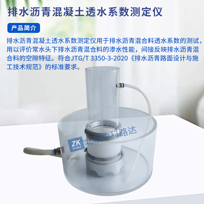排水瀝青混凝土透水系數(shù)測定儀用于排水瀝青混合料透水系數(shù)的測試,用以評(píng)價(jià)常水頭下排水瀝青混合料的滲水性能,間接反映排水瀝青混合料的空隙特征。符合JTG/T 3350-3-2020《排水瀝青路面設(shè)計(jì)與施工技術(shù)規(guī)范》的標(biāo)準(zhǔn)要求。